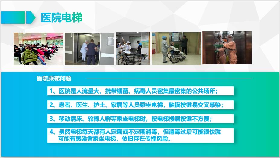 (2)患者、醫(yī)生、護(hù)士、家屬等人員乘坐電梯,觸摸按鍵易交叉感染;