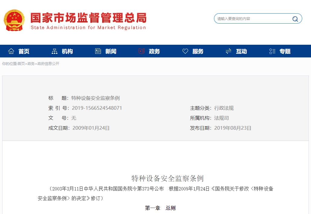 《特種設(shè)備安全監(jiān)察條例》2019年08月23日 國家市場監(jiān)督管理總局