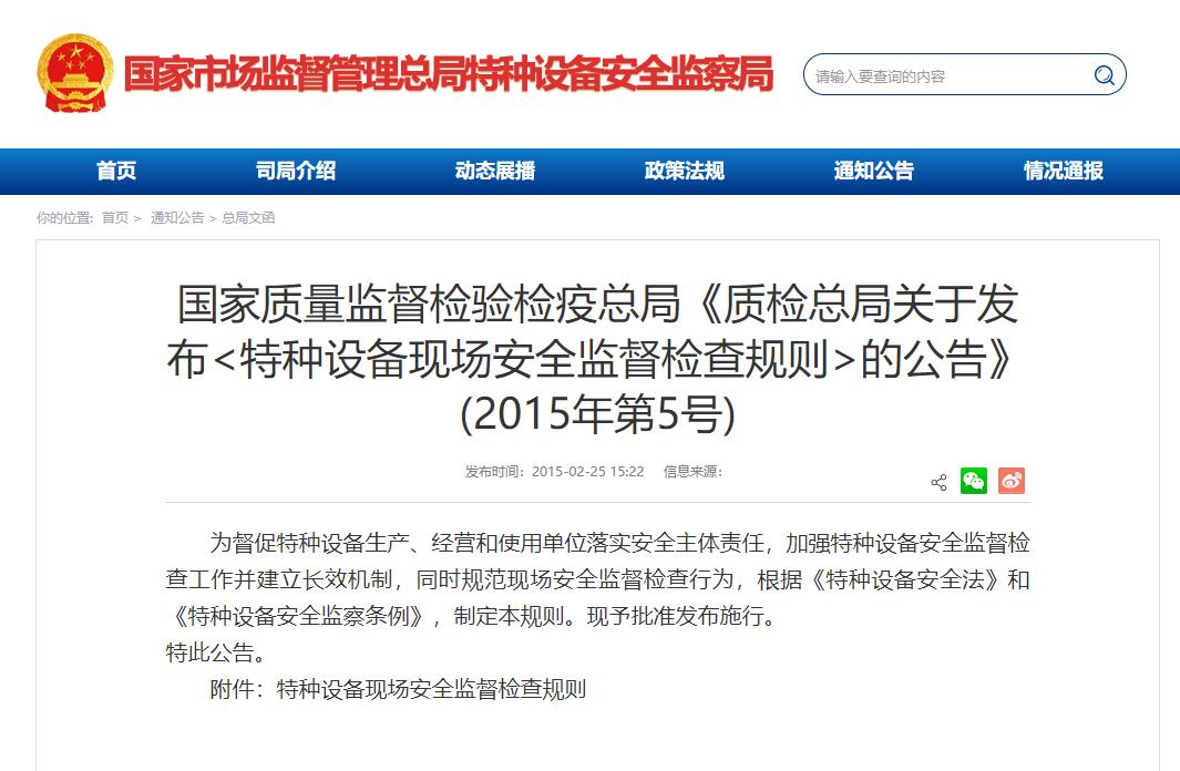 《特種設備現場安全監(jiān)督檢查規(guī)則》質檢總局2015年第5號
