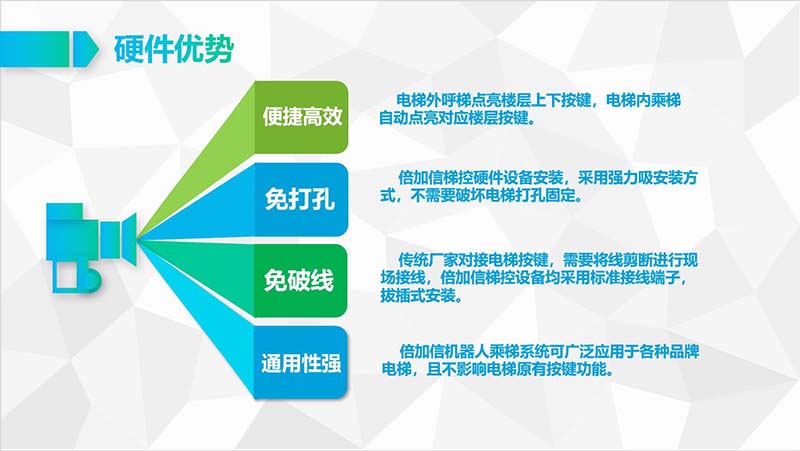 (4)倍加信機(jī)器人乘梯系統(tǒng)可廣泛應(yīng)用于各種品牌電梯,且不影響電梯原有按鍵功能。